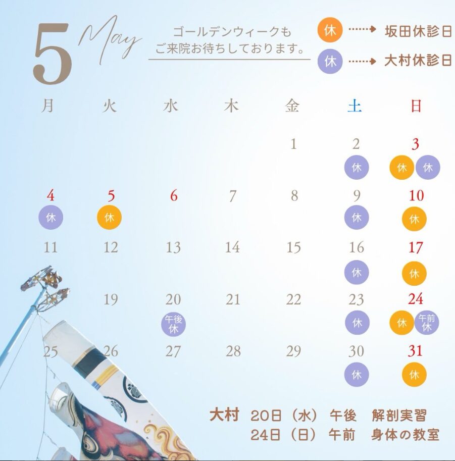 【坂田休診日】3日(日)5日(火)10日(日)17日(日)24日(日)31日(日)