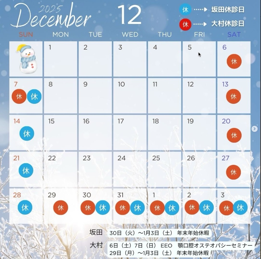 ※12/29(月)は坂田のみ診療・大村は休診となります。