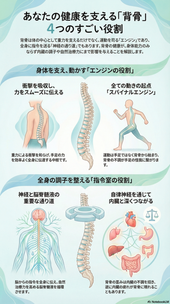オステオパシーの考え方では、脊柱は全身の健康の要であり、その動きの質が内臓機能や全身のバランスに影響を与えると考えられています。背骨の柔軟性や位置の偏りは、肩こりや腰痛など、様々な不調の原因になり得ます。今回は、ご自宅で安全に行える、背骨の体操をご紹介します。背中の緊張がほぐれ、姿勢が整う感覚をぜひ体験してください。