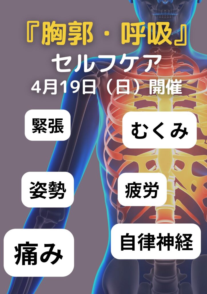 胸郭や肺は一日に2万回も動き、全ての細胞に酸素を送り届けています。そのため、胸郭・呼吸機能が少しでも低下すると、この2万回のエネルギー供給に支障をきたします。また、呼吸は自律神経にも影響を与えるため、様々な心身の不調に繋がることも。今回は、ご自身でできる優しいタッチと動きで、胸郭をゆるめ呼吸を整える方法をお伝えします。身体の基本、まずは呼吸から整えてみませんか?
