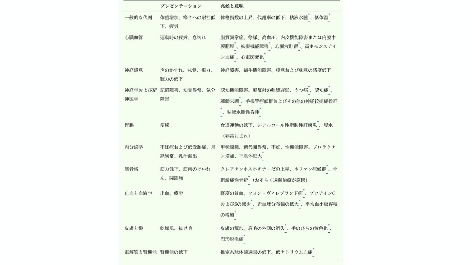 甲状腺機能低下症は、甲状腺ホルモンの不足によって引き起こされる疾患です。重症の場合、適切な治療を行わなければ生命を脅かすこともあります。この病気の特徴は、症状の幅が広く、全く自覚症状がない場合から、日常生活に大きな影響を及ぼすものまでさまざまです。