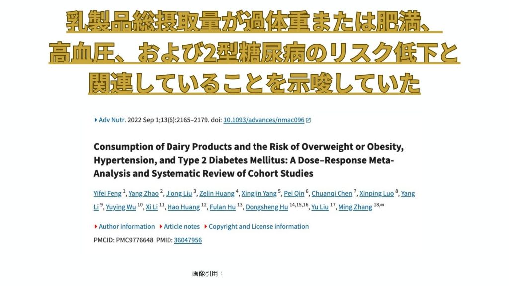 近年の系統的レビューでは、乳製品の摂取が過体重、肥満、高血圧、2型糖尿病のリスクを下げる可能性があると示唆されています。