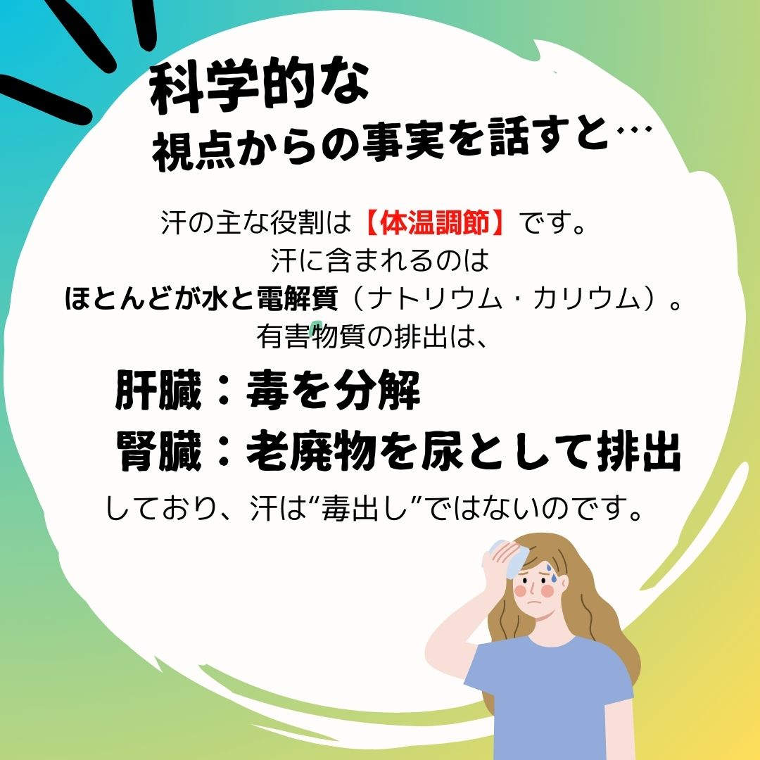 汗の本当の役割や、体の中で毒素を処理している臓器は別にあります。