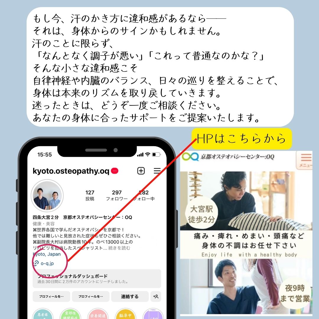 #京都オステオパシーセンターOQ #汗とデトックス #夏の健康 #自律神経 #体のサイン #オステオパシー #健康の知識 #夏バテ対策 #お盆 #健康豆知識 #姿勢と健康 #整体 #KyotoOsteopathy #osteopathy #detoxmyth