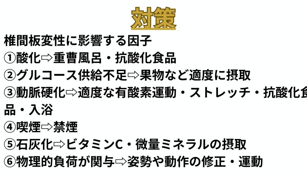 動脈硬化により、椎間板への血流が悪化し、栄養供給が不足します。適度な有酸素運動やストレッチ、抗酸化食品の摂取が予防に役立ちます。