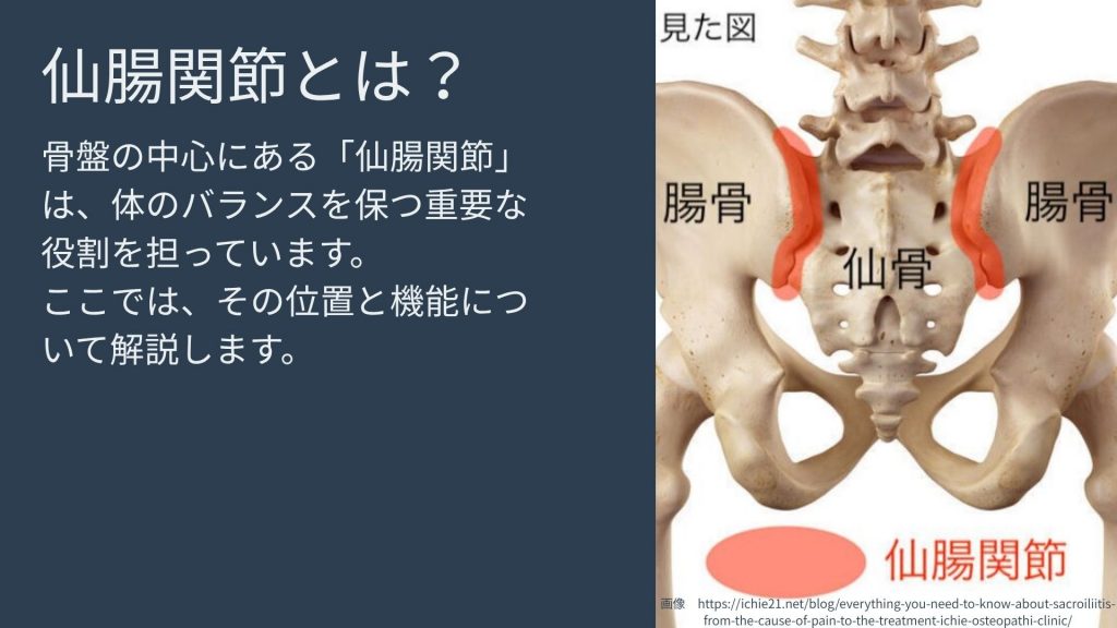 • 場所: 仙腸関節は、骨盤の中央に位置する逆三角形の「仙骨」と、その左右にある大きな「腸骨」が連結する部分に左右一対あります。ちょうどお尻のえくぼのあたり、少し内側に位置しています。