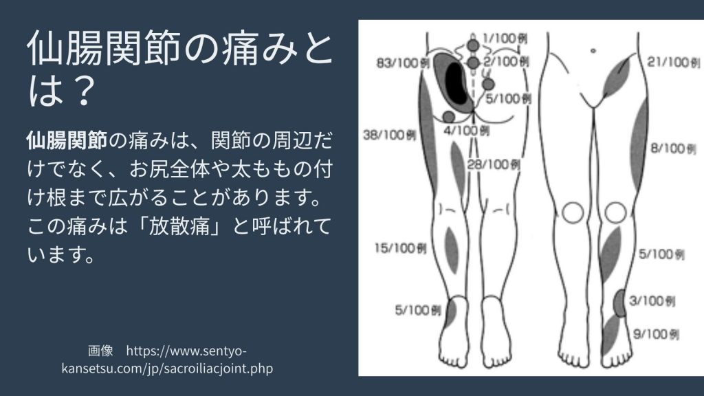 • なぜ放散痛が起こるのか: 仙腸関節周辺には、多くの神経が複雑に走っています。関節の炎症や機能不全によってこれらの神経が刺激されると、脳が痛みの発生源を誤認し、仙腸関節とは別の場所で痛みを感じてしまうためです。