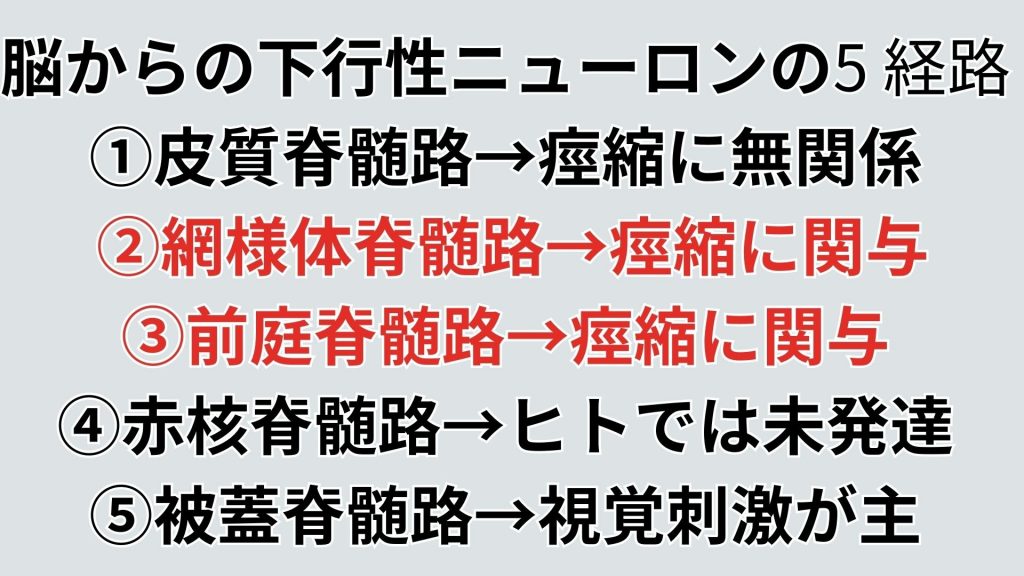 痙縮には、皮質脊髄路(CST)よりも網様体脊髄路(RST)や前庭脊髄路(VST)が大きく関与していると考えられています。