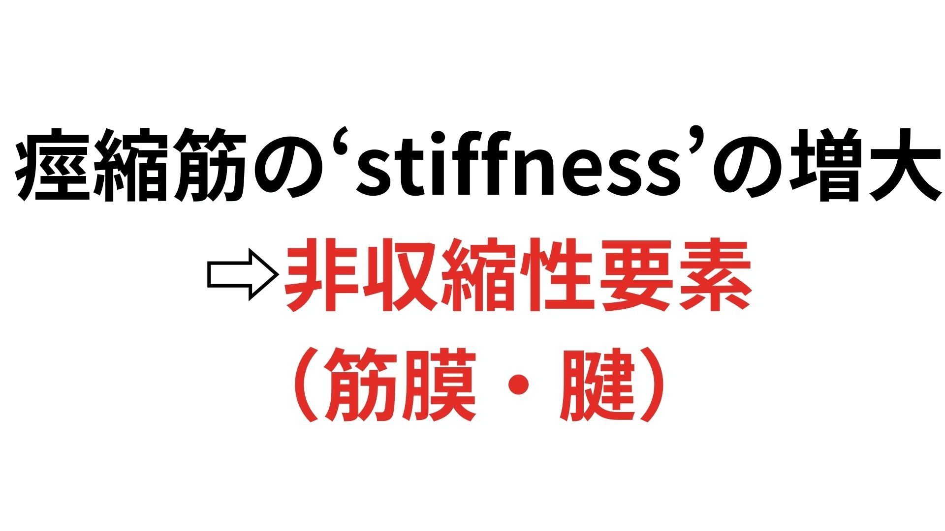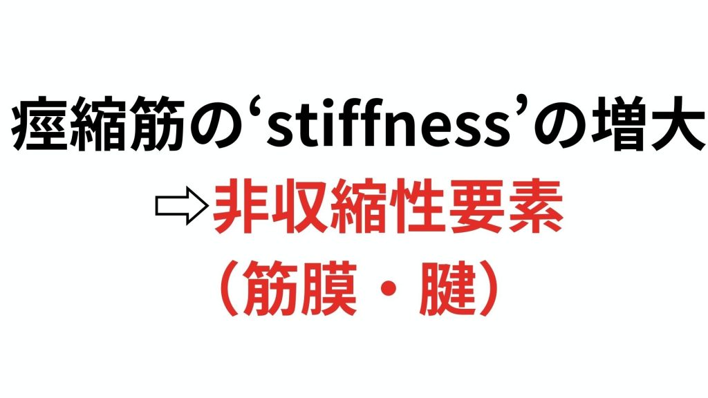 痙縮により筋が過剰に収縮するだけでなく、筋そのものの「stiffness(剛性)」も増大します。これは、筋線維の構造的変化や、筋膜・腱などの非収縮性要素が影響しているためです。