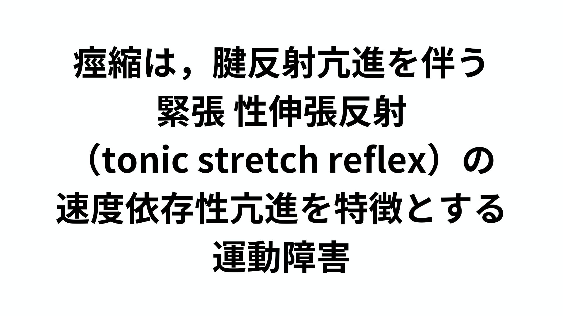 痙縮とは、腱反射の亢進を伴う緊張性伸張反射(tonic stretch reflex)の速度依存性亢進を指します。脳梗塞や脊髄損傷などの中枢神経損傷後に生じ、筋の過剰な緊張を引き起こします。