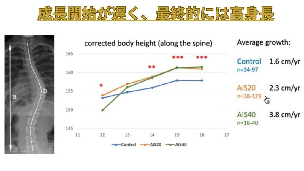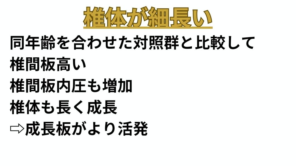 また、AIS患者の椎間板は健常者と比較して厚みがあり、椎間板内圧も高いことが報告されています。これにより、脊柱の成長バランスが崩れ、側弯が進行しやすくなります。