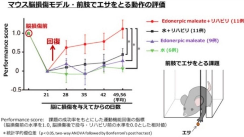 研究では、脳損傷を受けたマウスにedonerpic maleateを投与し、リハビリと併用したところ、運動機能の回復が大幅に促進されることが示されました。この薬は、神経伝達に関わるAMPA受容体のシナプス移行を促進し、損傷後でも神経回路の再編が進むことが確認されています。