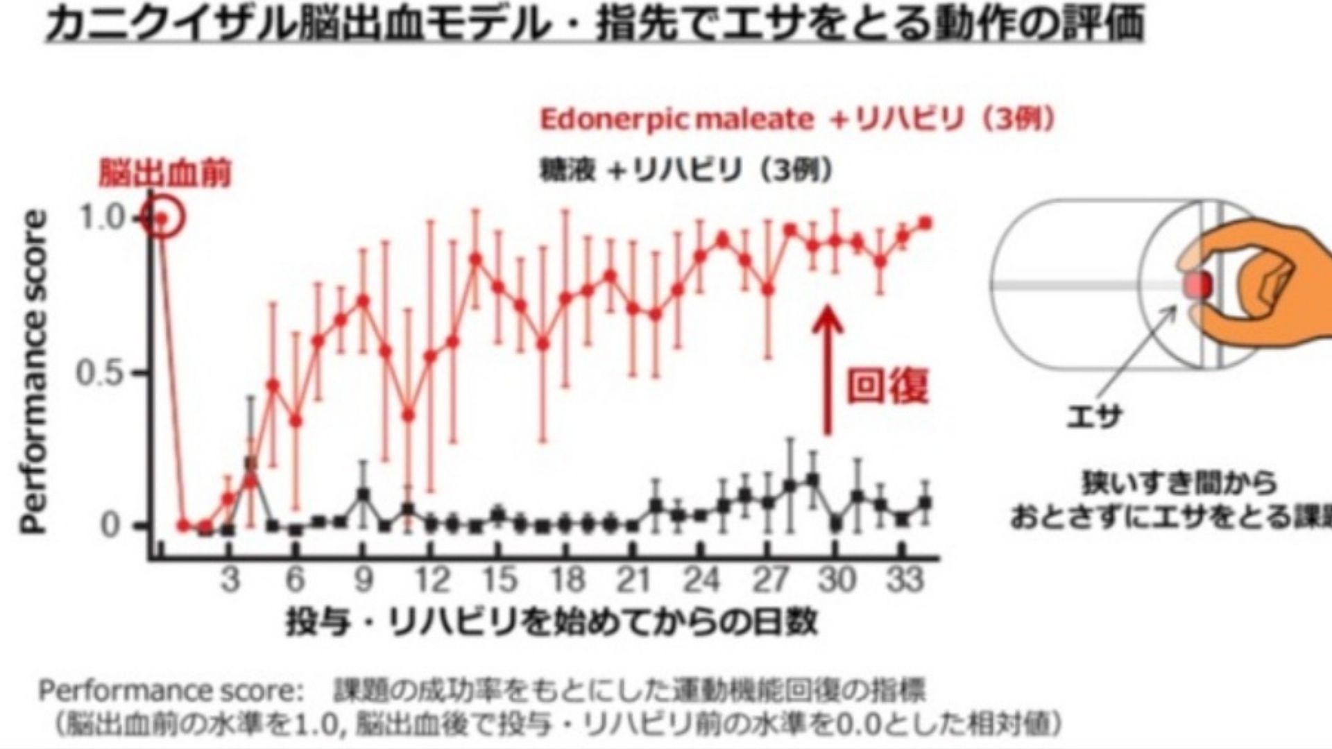 マウスだけでなく、よりヒトに近い霊長類(カニクイザル)を使った研究でも効果が確認されました。脳出血後のサルにedonerpic maleateを投与し、リハビリを行ったところ、「指でものをつまむ」という高度な運動機能が回復したのです。
