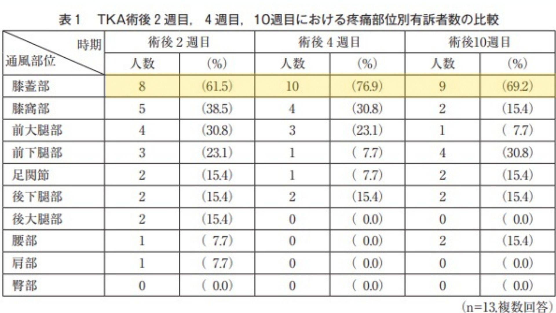 - 術後4週間:まだ膝蓋部の痛みが多く見られます。