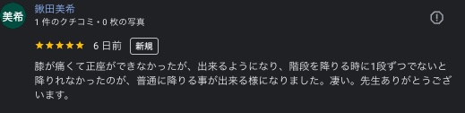 膝の痛みで悩んでいた女性の方から施術の感想をいただきました。