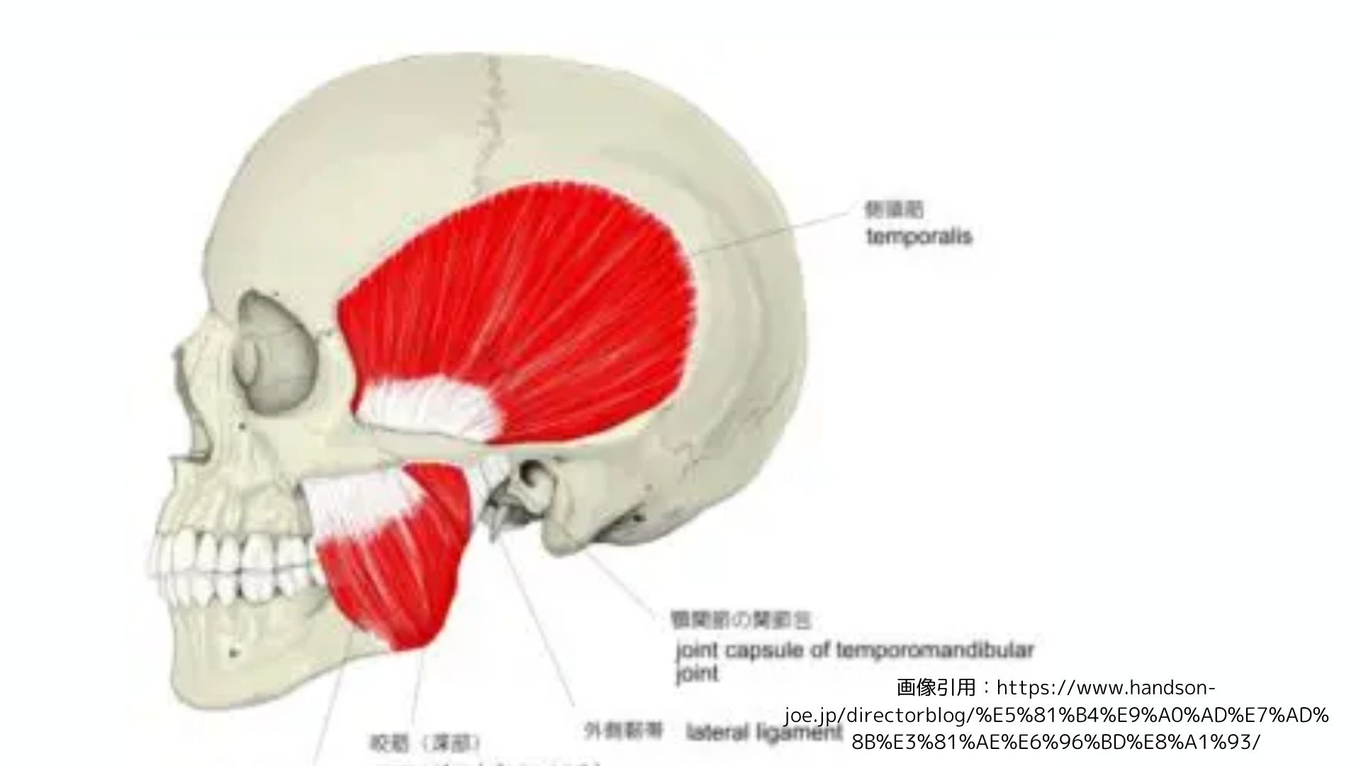 咀嚼筋とは、側頭筋・咬筋・内側翼突筋・外側翼突筋など、顎を動かす筋肉群のことです。
