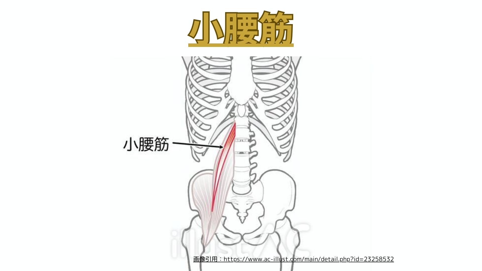 小腰筋は、大腰筋と並走しながら腰椎から骨盤の腸恥隆起に付着する細長い筋肉です。退化傾向にあるため、存在しない人もいますが、ある場合は腰椎と骨盤を安定させる役割を担います。